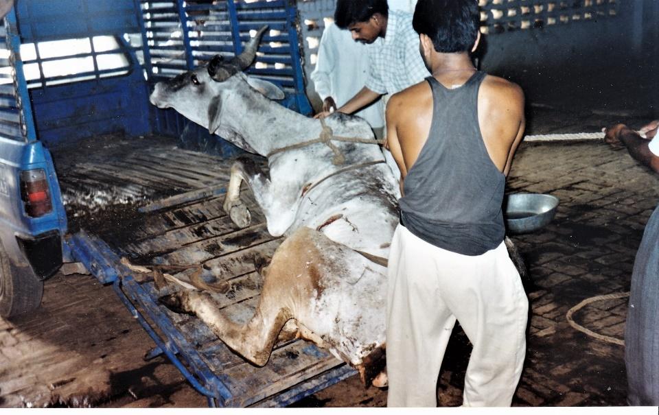 Slaughtering cattle was made illegal in all states except Kerala and West Bengal at the end of British rule that pressed for regional slaughter. So now millions of these gentle cattle, many well- loved family cows and hard-working bullocks who once pulled carts and ploughs are sent by road, rail and on bleeding hooves as we have witnessed, across the continent to these locations. Many die in transit.