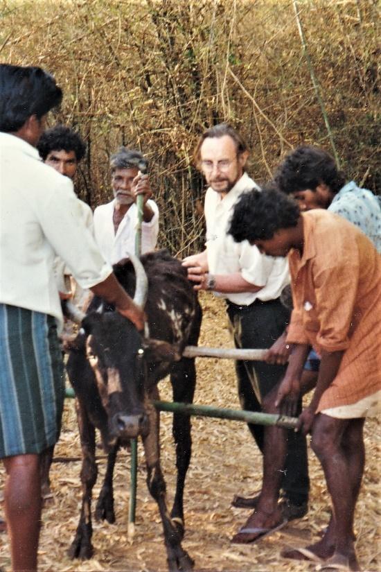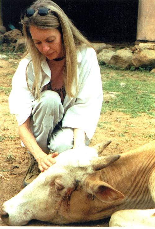 Co-author Krantz at her animal refuge in India attends to a bullock blinded in one eye by a vegetable stall vendor. Co-author Fox rescues starving bullock kept to produce manure for illegal sale as fertilizer then be sold for skin and bone, one of hundreds of thousands infesting wildlife preserves across India